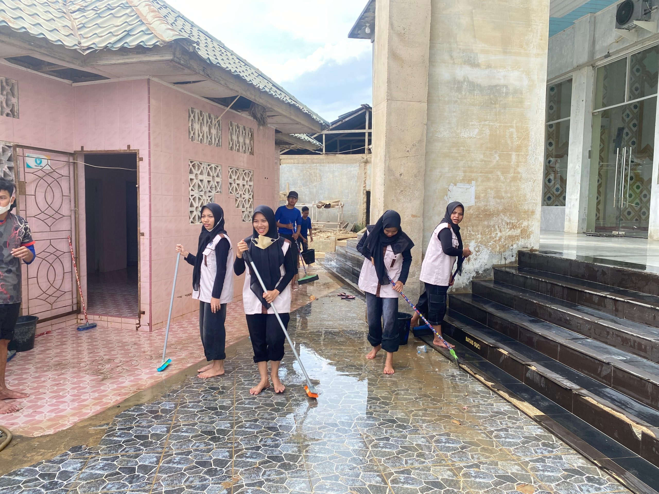 Fasilitas Sanitasi: Tempat wudhu, kamar mandi, hingga saluran air disikat tuntas dari sisa lumpur, memastikan standar higienitas kembali normal.