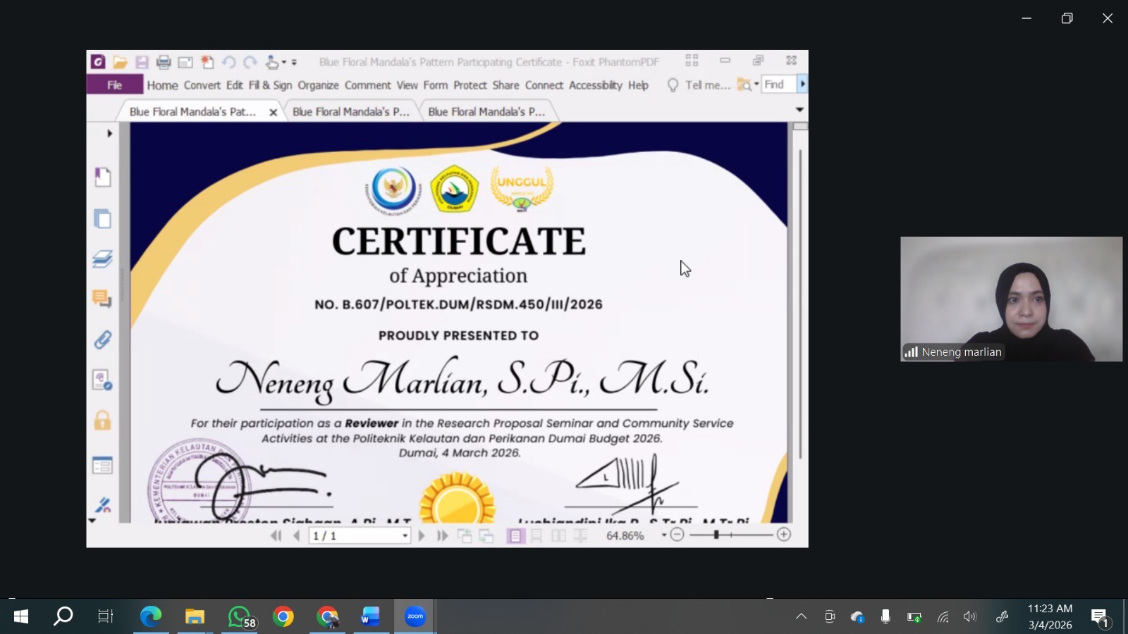 Meulaboh | Aceh Barat, 04 Maret 2026 — Dalam upaya menghasilkan penelitian dan program pengabdian kepada masyarakat yang inovatif serta berdampak nyata bagi lingkungan, kolaborasi lintas institusi pendidikan tinggi menjadi hal yang krusial. Mewujudkan hal tersebut, Dosen Program Studi Sumber Daya Akuatik, Neneng Marlian, S.Pi., M.Si., diundang secara khusus menjadi Reviewer Eksternal dalam Seminar Proposal Penelitian dan Pengabdian Dosen di Politeknik Kelautan dan Perikanan (Poltek KKP) Dumai, Provinsi Riau.